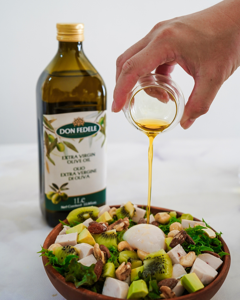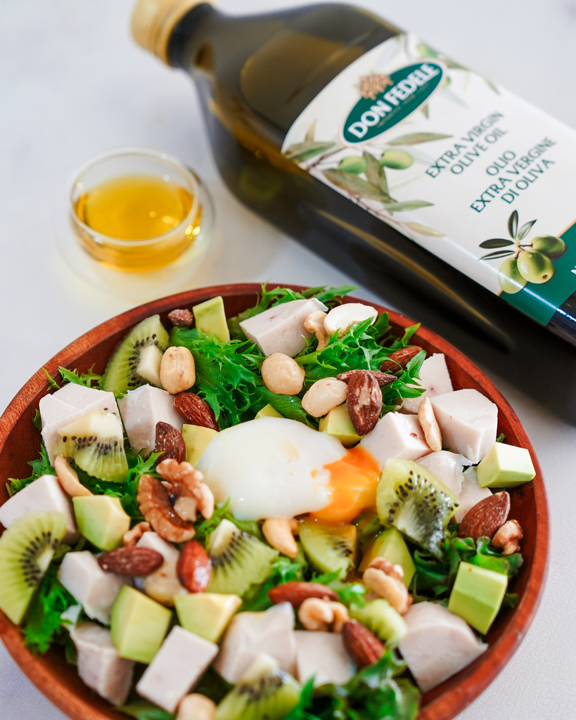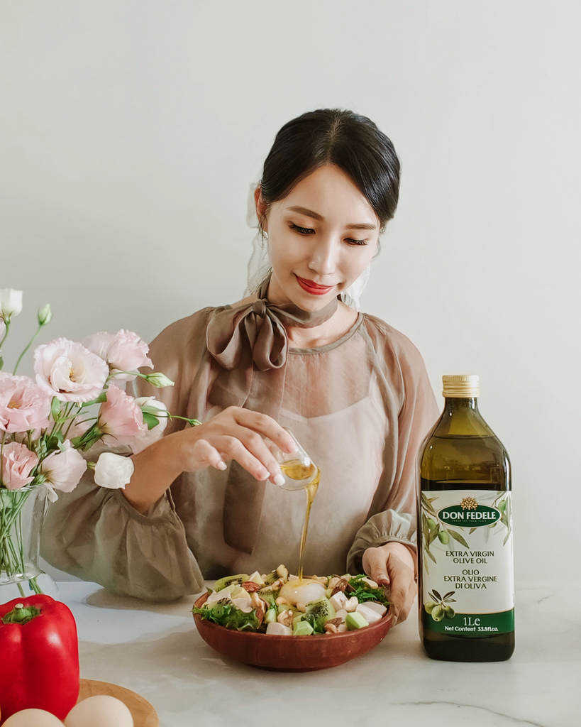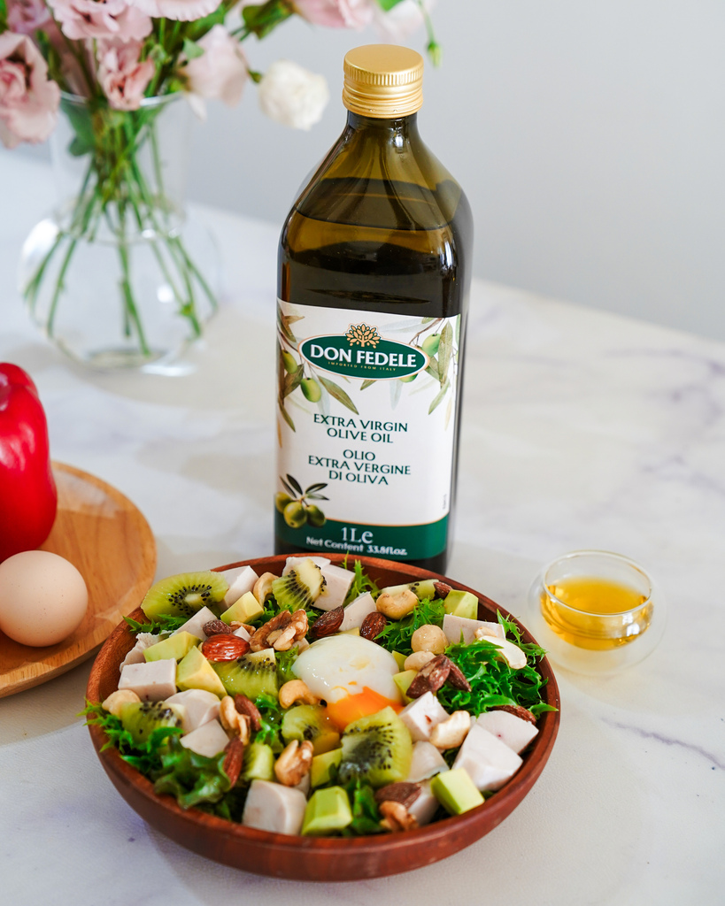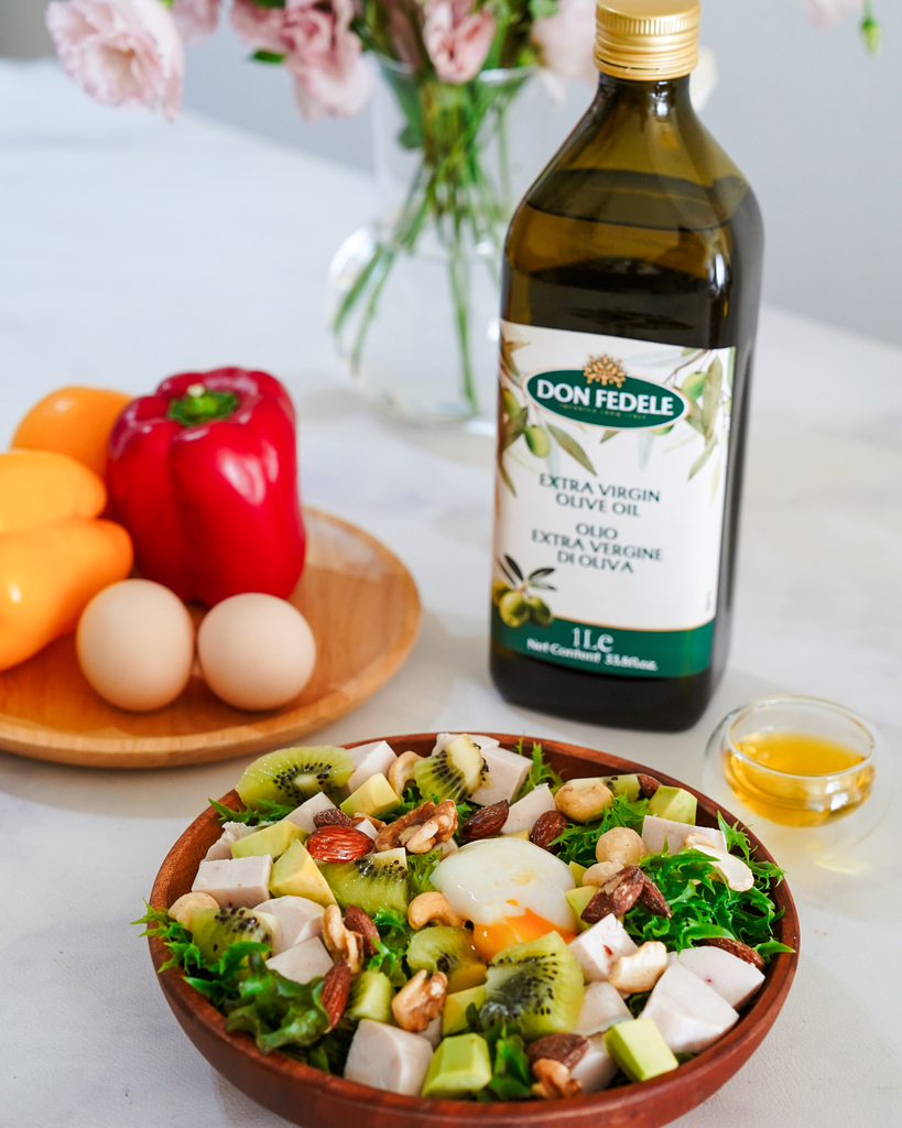 我最常中午在家吃的輕食沙拉,準備好食材就能輕鬆組合成一盤美味營養均衡的沙拉!最後淋上義大利DON FEDELE 特級初榨冷壓橄欖油,讓人品嘗更無負擔感,吃到純粹的橄欖油,也讓整盤沙拉口感更增添香氣!