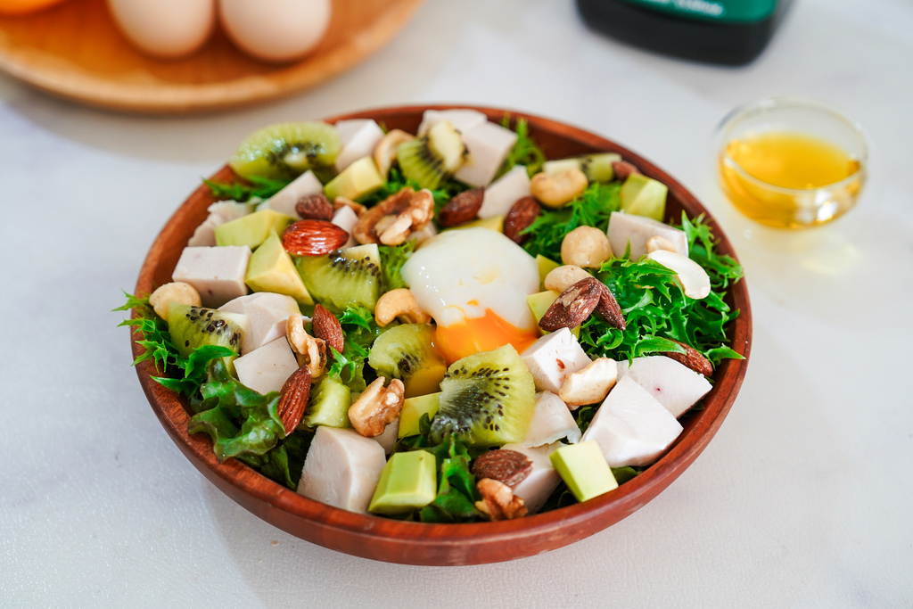 食材:酪梨、舒肥雞胸肉、堅果、生菜、溫泉蛋、奇異果、義大利DON FEDELE 特級初榨冷壓橄欖油