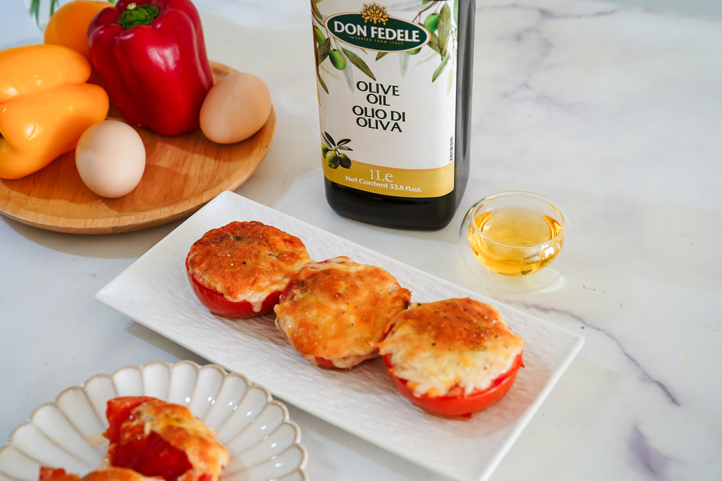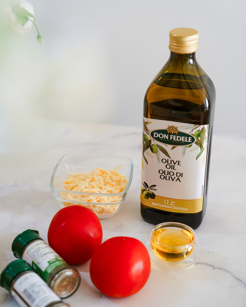 食材:牛番茄、焗烤起司絲、胡椒鹽、義式香料粉、義大利DON FEDELE 純橄欖油