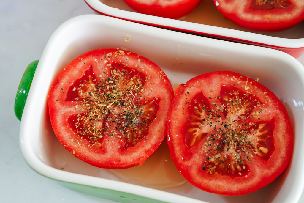 1.先把牛番茄洗淨剖半,放在烤盤內