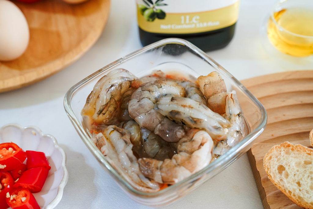 1.先將蝦子剝殼、去腸泥,用米酒和胡椒鹽抓醃一下