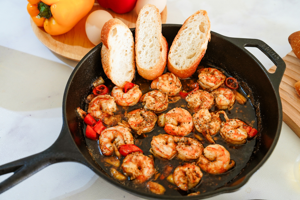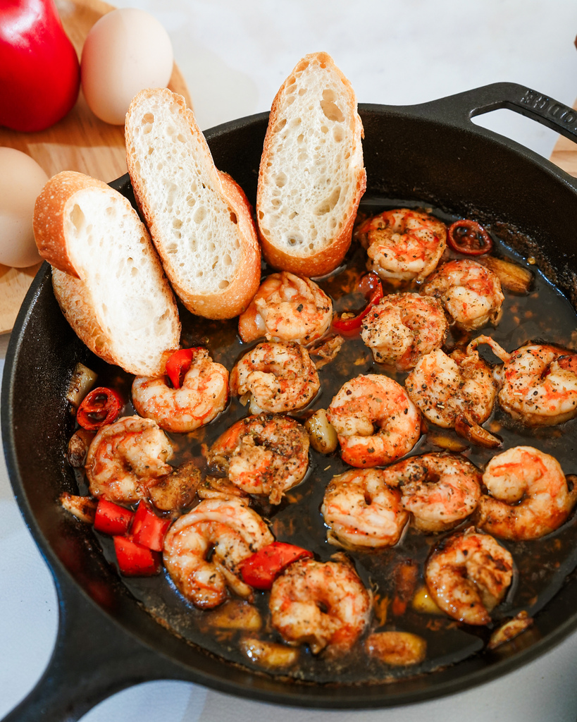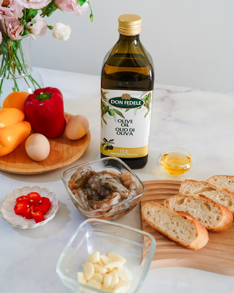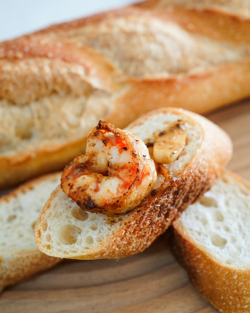 食材:橄欖油150cc、蝦子20隻、蒜頭8瓣、辣椒、米酒、胡椒鹽、法棍麵包