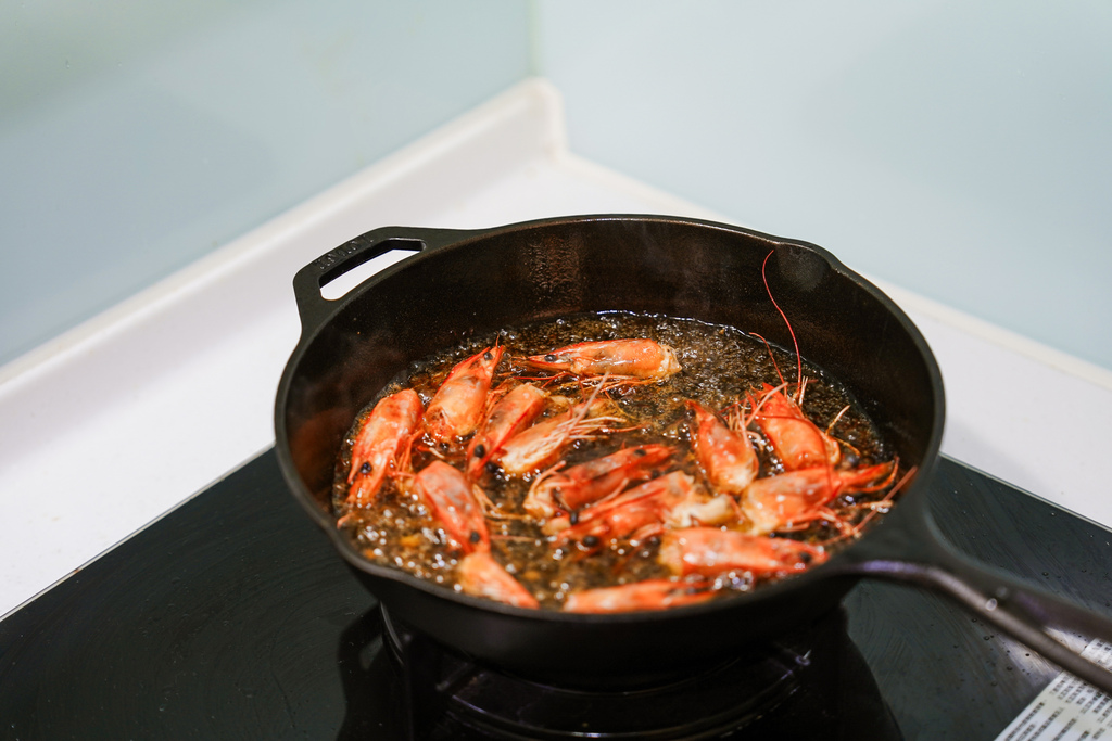 2.鍋內倒入150c.c義大利DON FEDELE 純橄欖油,先放入蝦頭擠出蝦膏,煉出蝦油