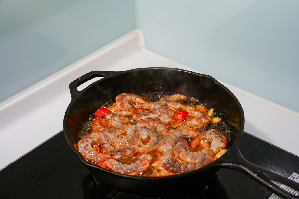 3.接著加入蒜片、辣椒與蝦子,以橄欖油浸泡的方式,將蝦子煮熟即可。