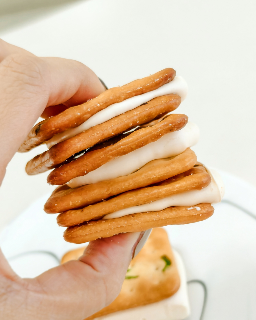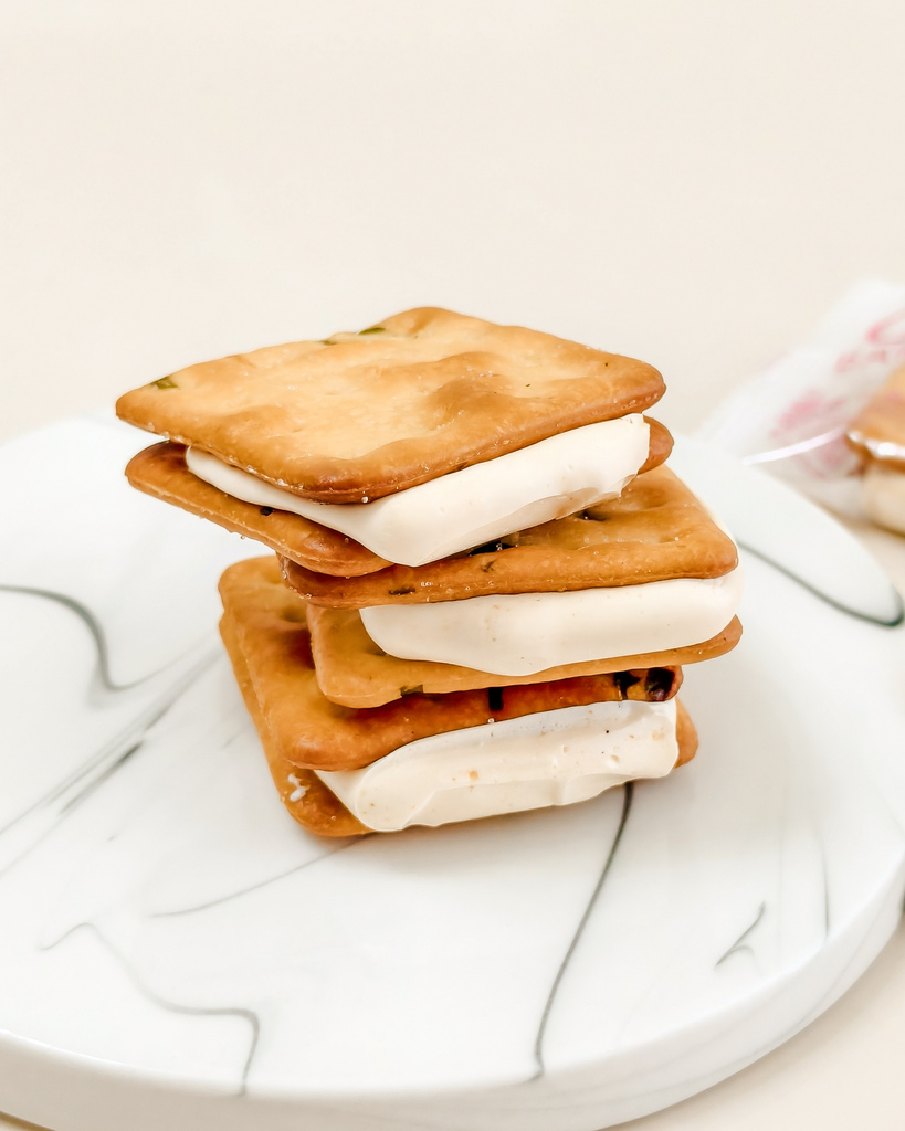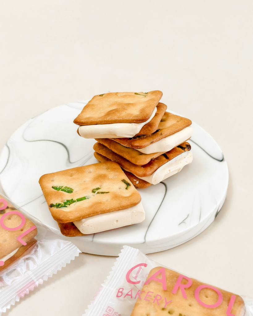 外層是香蔥蘇打餅夾餡凱樂超人氣牛軋糖,一口咬下是很酥脆的,中間牛軋糖軟軟QQ,很喜歡這樣鹹甜交織的層次好味道!