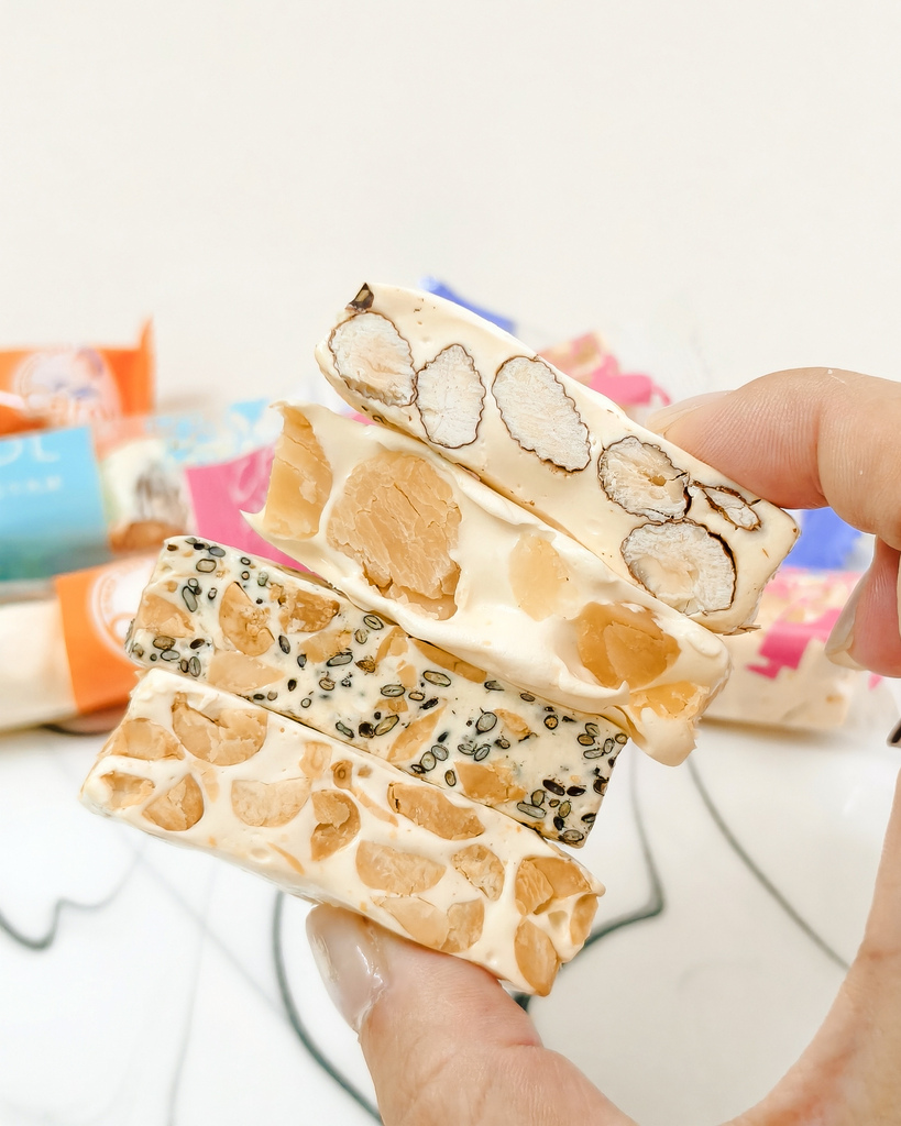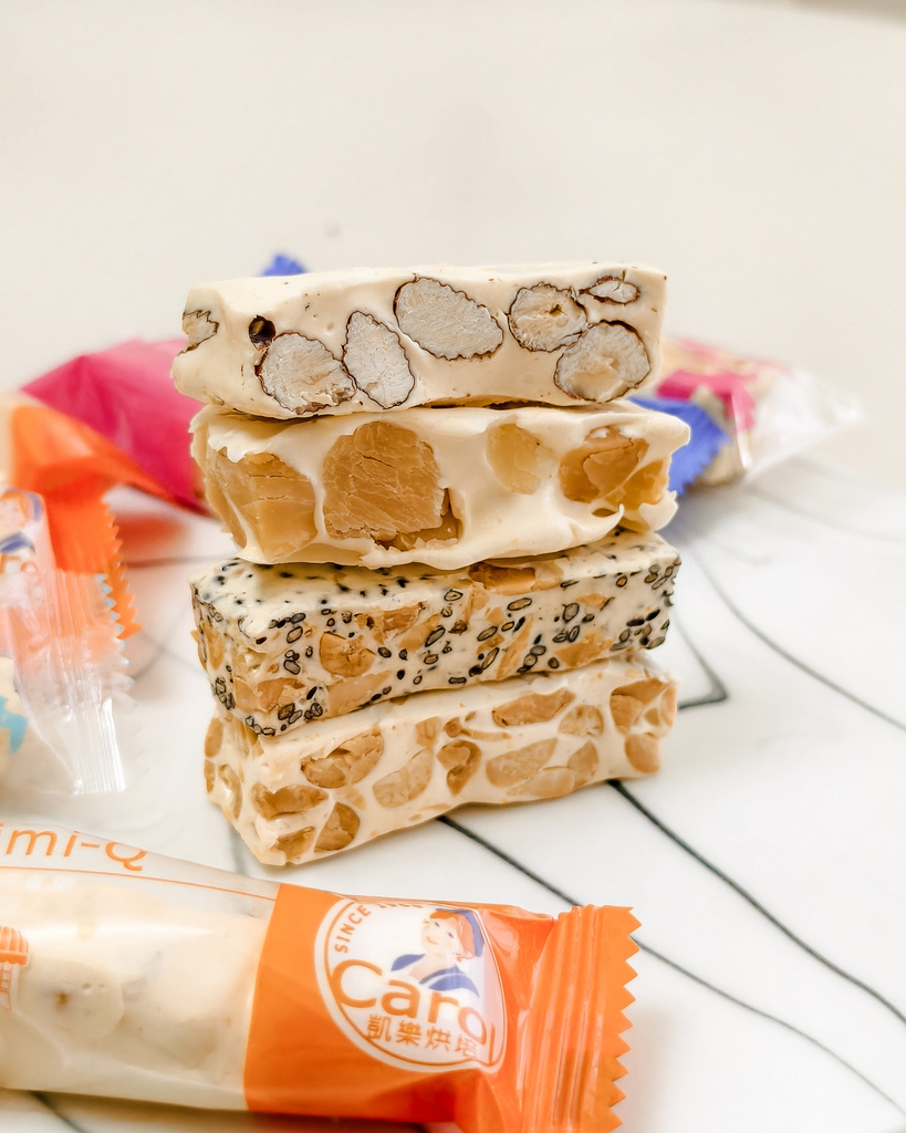 禮盒可以一次吃到四種口味的牛軋糖,有花生、芝麻、杏仁、夏威夷口味,每一款都帶有嚼勁軟Q的口感,不黏牙是讓人喜歡的特點,加上有堅果提味,口感上非常豐富呢!