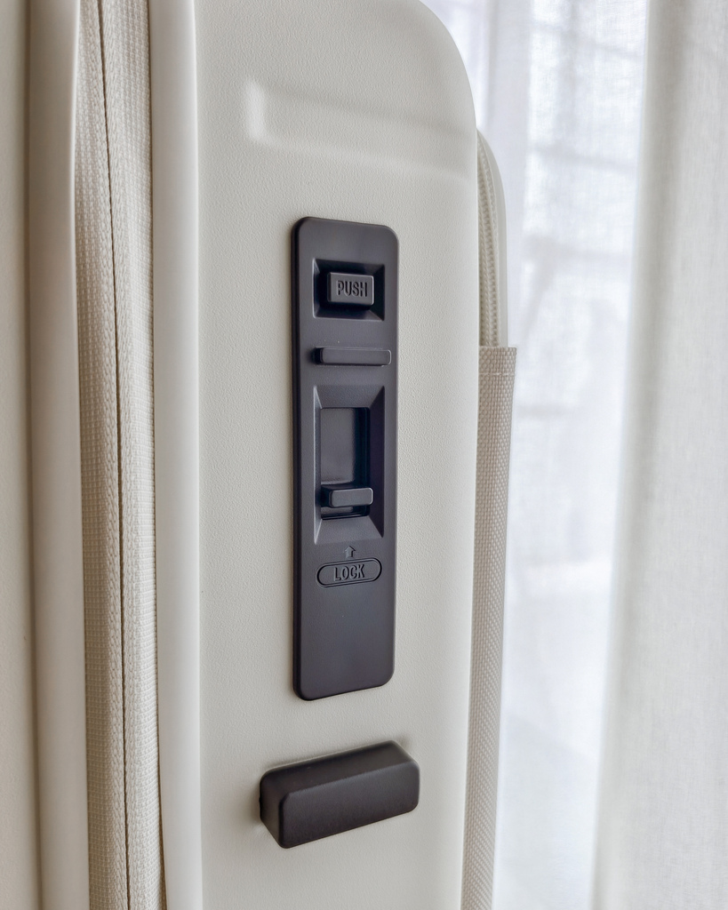 整體質感非常好,四角圓潤設計看起來很舒心,行李箱側邊還有掛勾設計,可以掛上購物袋之類的,讓雙手負擔不會那麼重