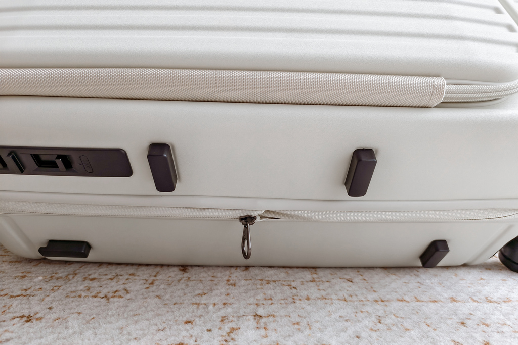行李箱底部也設計了不少實用功能,有防磨腳釘,不擔心行李箱表面橫著放直接碰觸地面