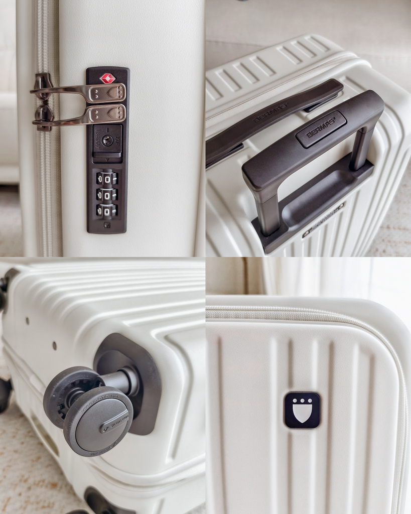 很多質感細節都讓人對這款行李箱不得不愛,有不怕被海關破箱的國際認證TSA海關密碼鎖、航太級鋁合金拉桿、日本靜音輪煞車系統...