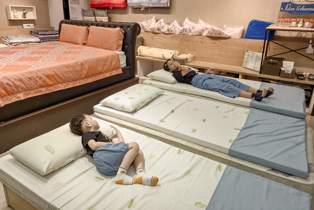 另外也有乳膠床墊、乳膠枕的試躺,價位也都挺合理的,我們家兩位一看到床就躺上去,也太舒服了吧!!