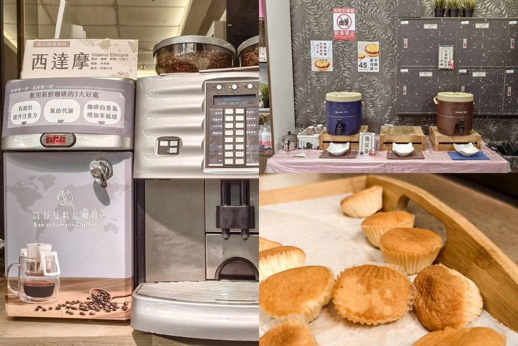 讓人感到貼心的就是這裡提供現磨咖啡、黑豆茶、牛蒡枸杞茶、半熟起司塔、小蛋糕...,無限取用真的不用客氣!因為拍照彩繪區無法飲食,館內提供了一間藍晒圖風格的咖啡廳,讓大家可以在這裡放心享受下午茶時刻