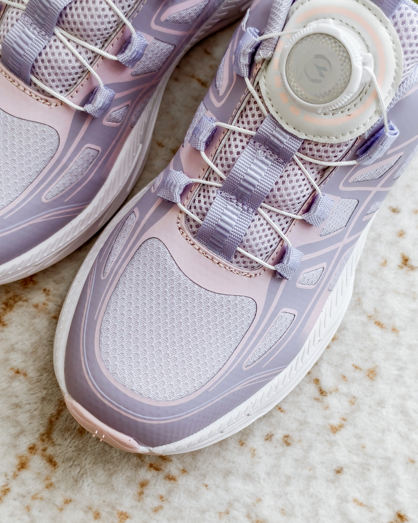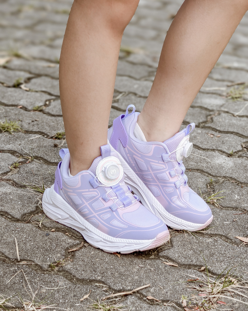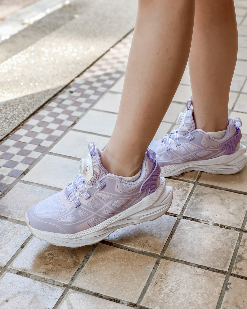 鞋面不用鞋帶,以旋鈕扣替代也是流行趨勢,方便穿脫也能讓孩子自己掌握鬆緊度,跑步運動兼不煩惱鞋帶脫落的問題