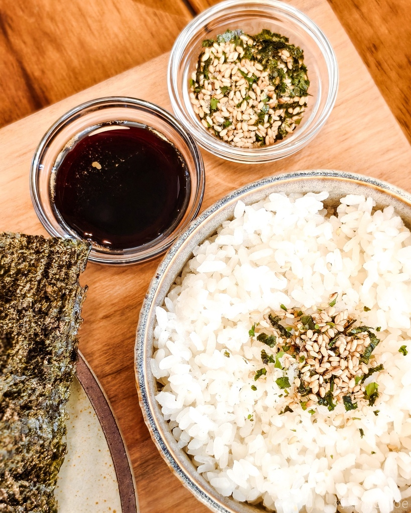 除了酪梨漢堡,還有一碗香噴噴的泰國米,加點芝麻香鬆,根本讓人一口接一口啊!另外也能搭配一旁的海苔片包飯一起吃,小朋友也會愛上