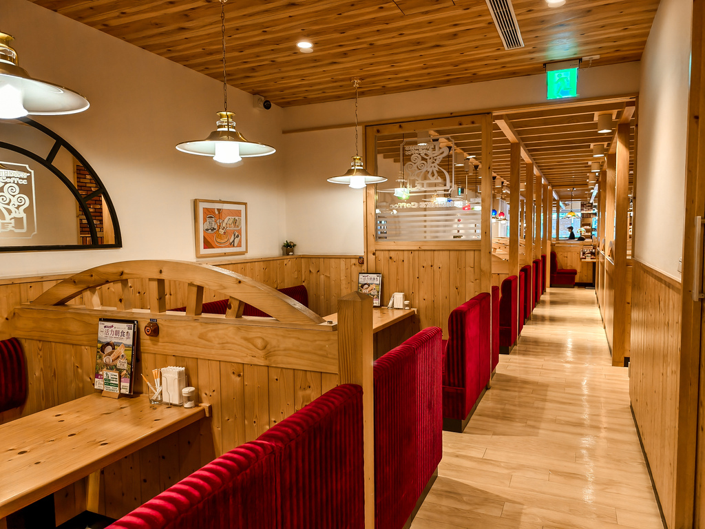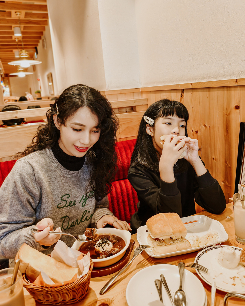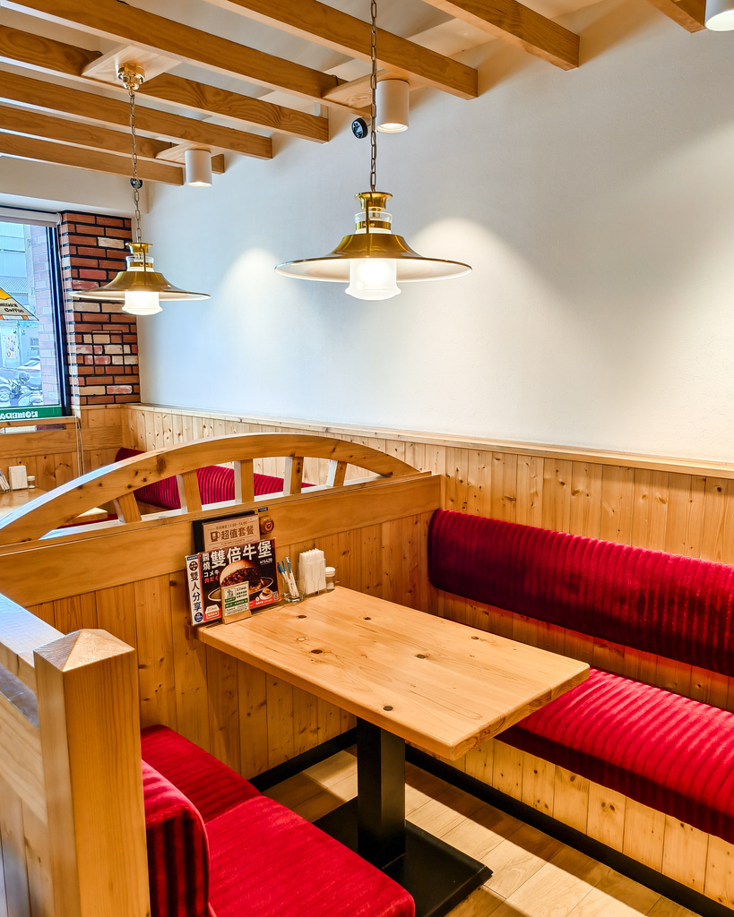 座位區很多,以木質調設計搭配紅色復古座椅,真的讓人有像秒到日本喫茶店,進入店內會由店員帶位,如果有小小孩的話,也可以詢問店員是否可安排離兒童遊戲區近的座位區喔!