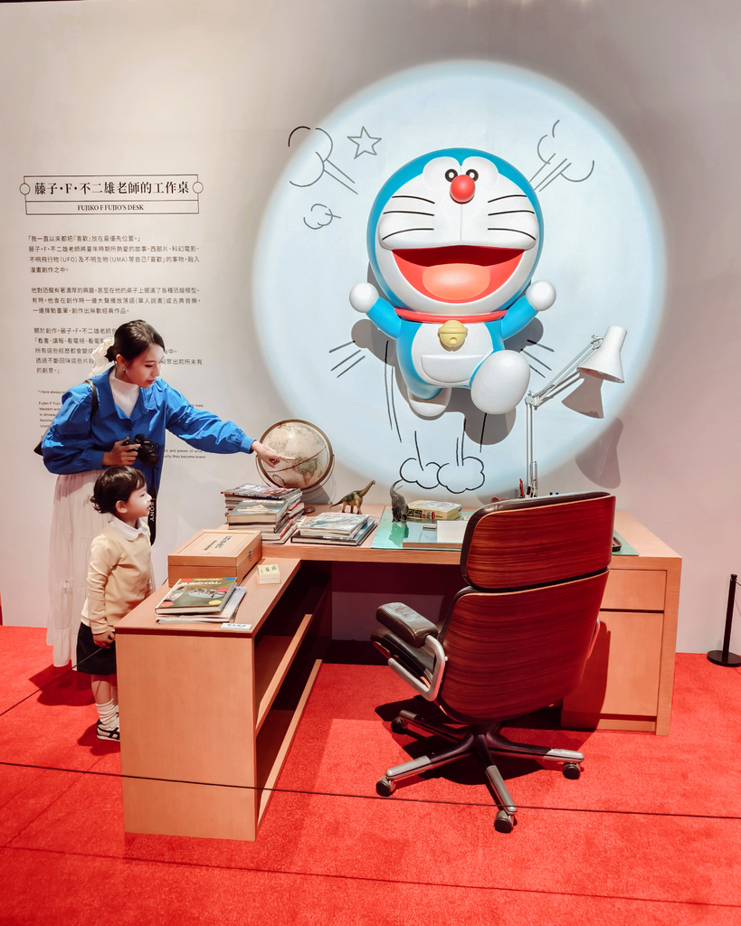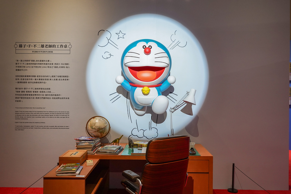 大家肯定很好奇哆啦A夢漫畫作者藤子・F・不二雄創作時的工作桌,這次展覽就現場復刻給大家看,桌上有很多老師創作靈感的擺件和書籍,讓大家一窺究竟!