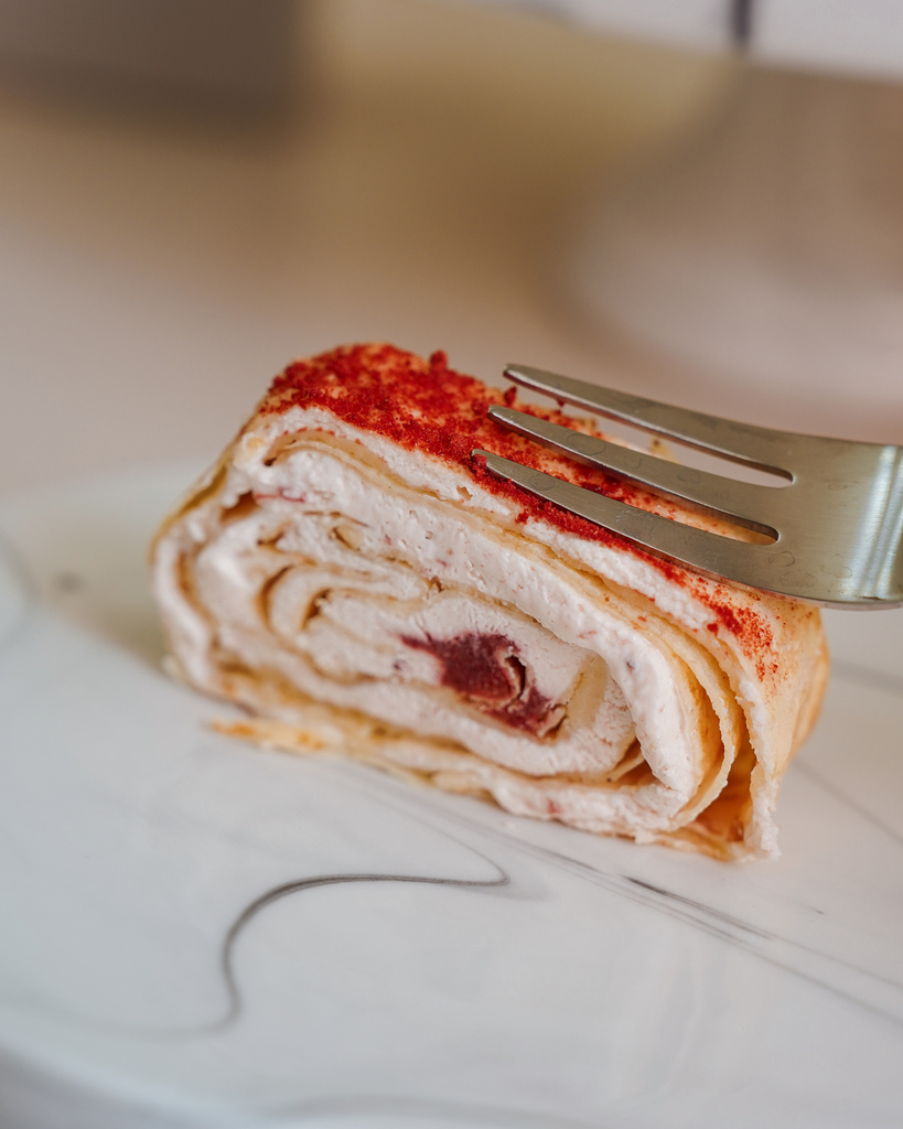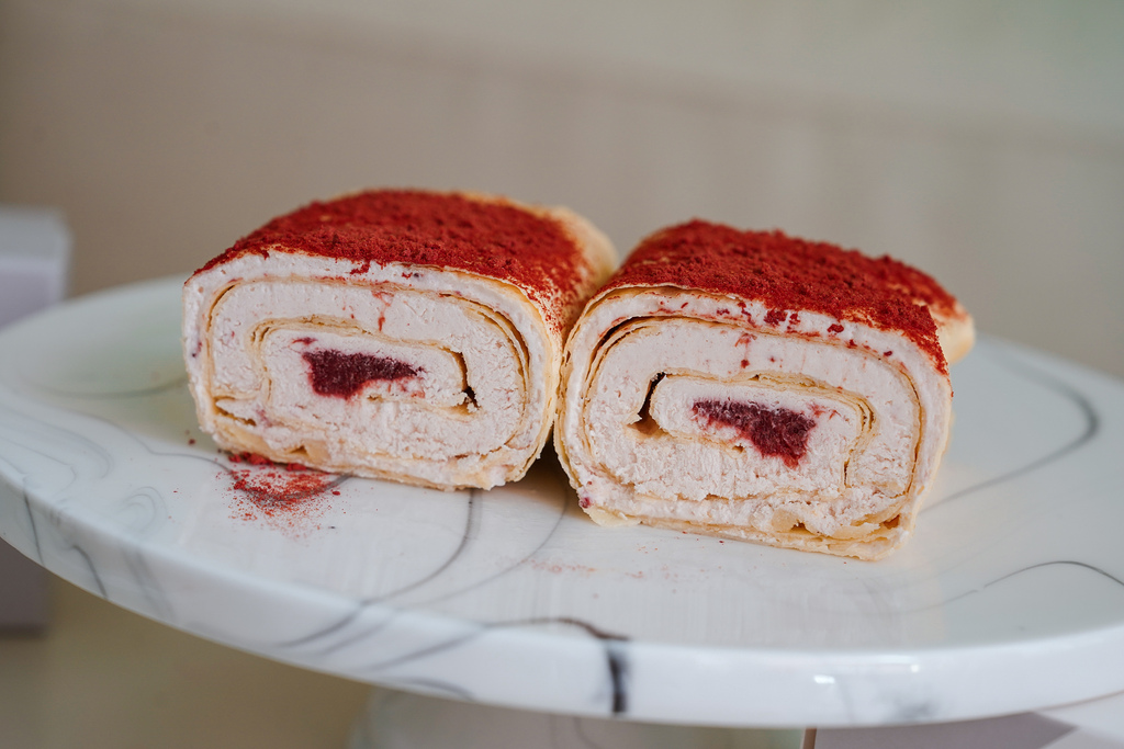 光是從外觀就覺得好精緻,充滿日式細膩工法,以輕薄柔軟的可麗餅皮包裹著奶油與草莓餡,細膩的好滋味在口中散開,柔滑的奶油與比利時莓果餡搭配得剛剛好,吃起來輕甜不膩,加上那充滿蛋香的可麗餅皮,讓人一口就愛上