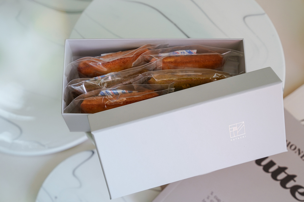 費南雪的外型很討喜,就像金磚般,送禮自用都充滿寓意,Katachi費南雪禮盒有三種口味,每一款都很好吃喔,費南雪好吃的關鍵在於烘烤前的蛋糕奶油餡需低溫熟成靜置12小時,加上手工注膜烘烤,外皮微酥,內餡濕潤,簡單又迷人的好滋味!