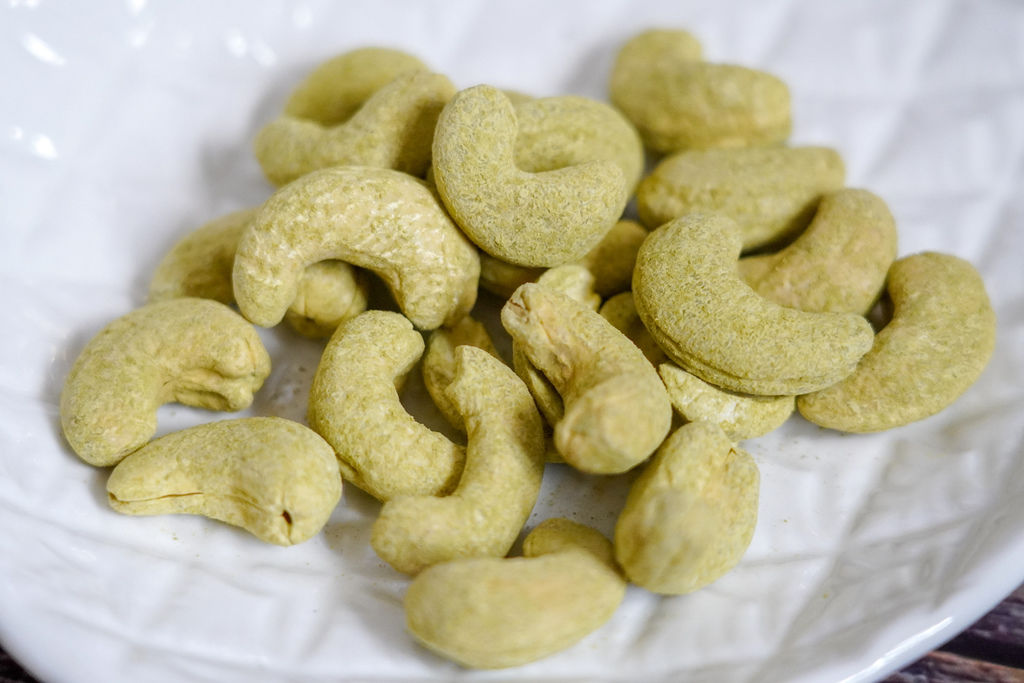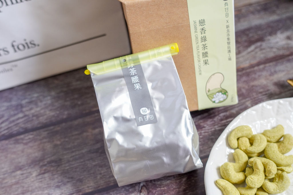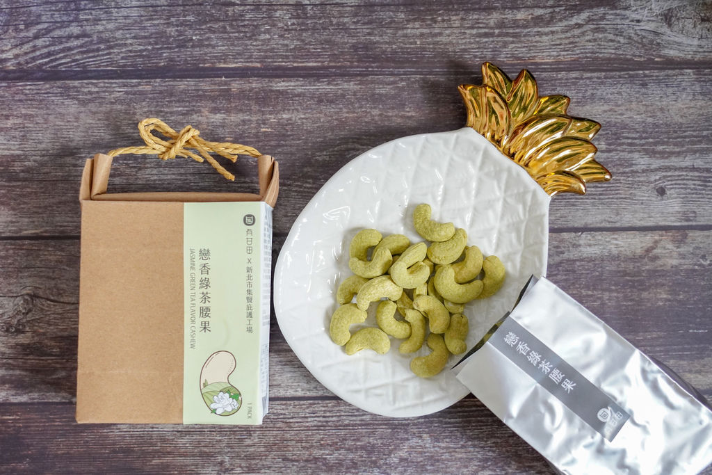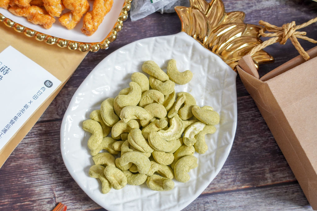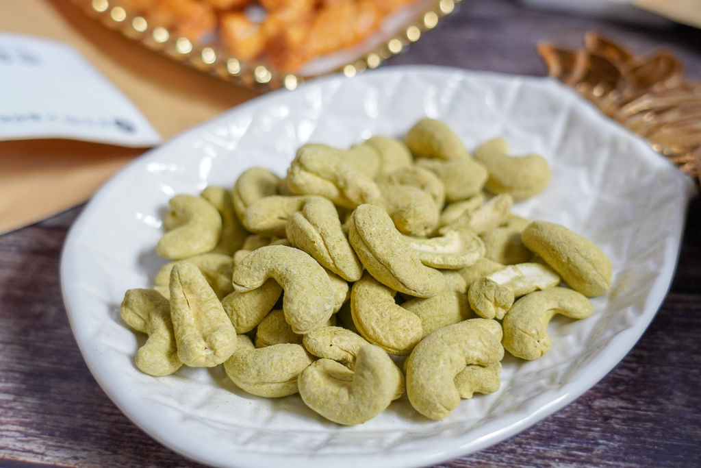 第一次品嘗到會讓我念念不忘的調味腰果,均勻地裹上茉香綠茶粉
