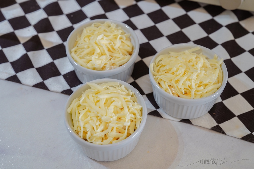 2.裝入烤杯裡,表面鋪上起司絲,放入烤箱180度烤15分鐘,看到焗烤起司呈現金黃即可