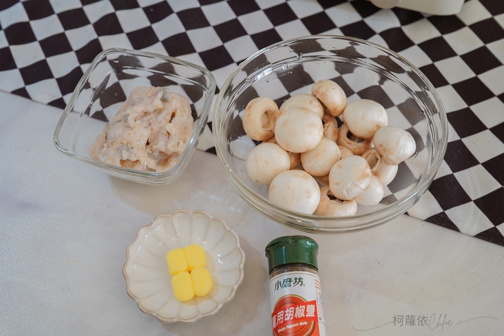 食材:蘑菇200g、花枝蝦滑1條、胡椒鹽適量、奶油10g
