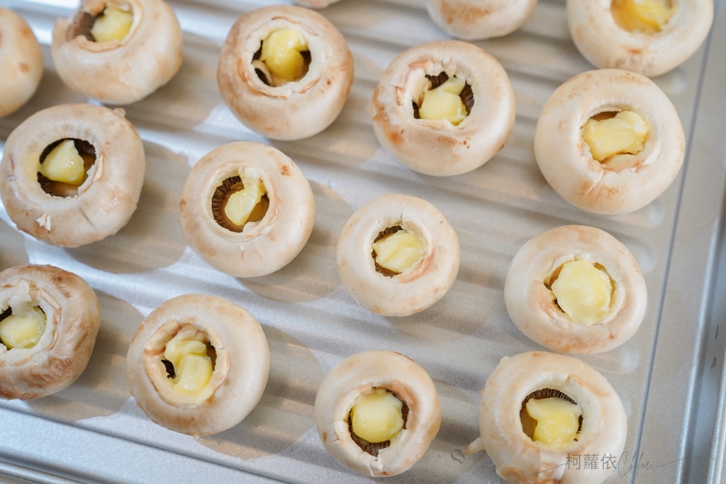 1.蘑菇洗淨後,去除蒂頭,將適量奶油填入蘑菇中