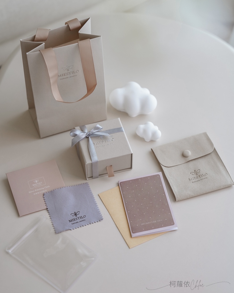每件MIESTILO飾品基本包裝會有品牌絨布袋、拭銀布、飾品專用密封袋,耳環會加附酒精棉片,不過如果有送禮需求的朋友,可以加購精緻禮盒包裝,精緻緞帶禮盒很有質感!