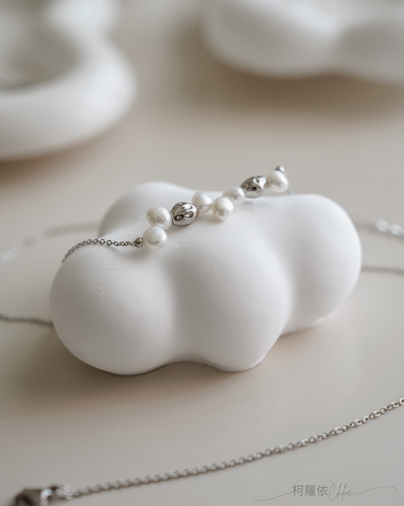 一顆顆獨有造型的鋼珠與不規則巴洛克珍珠,錯落交織串成視覺上很像海浪舞動般的項鍊