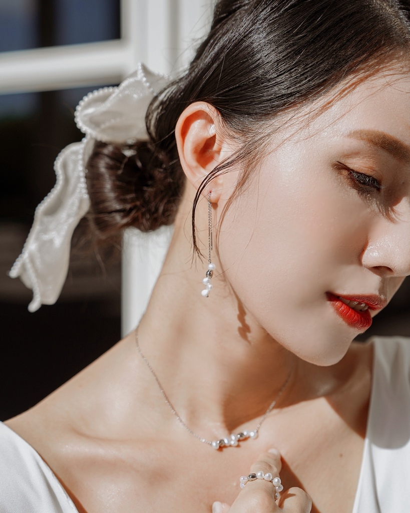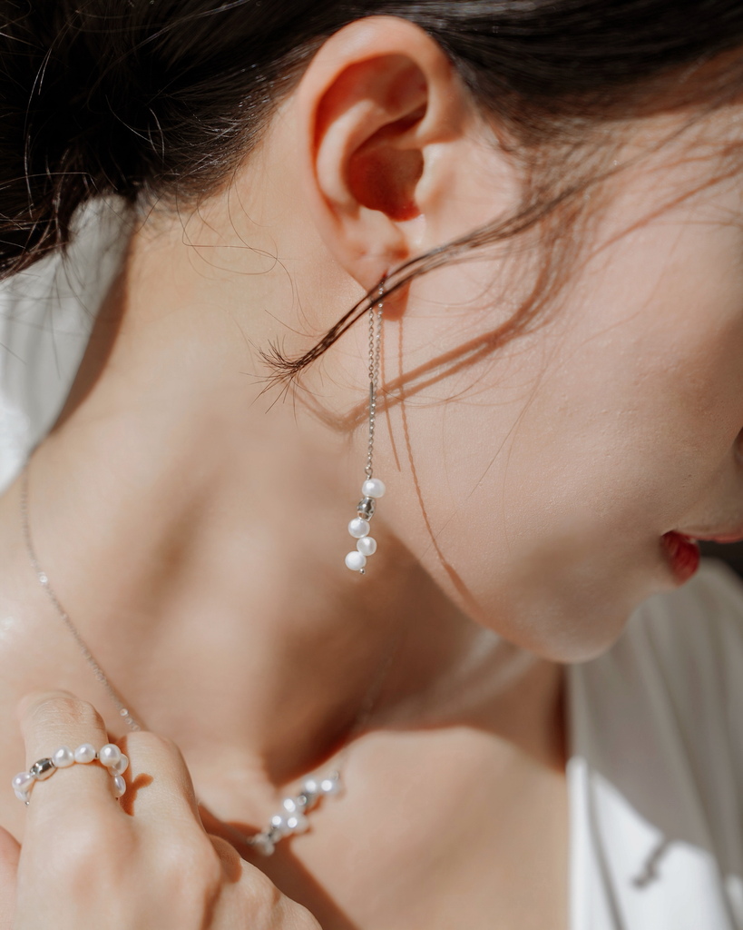 充滿浪漫氛圍感,一串串的珍珠與金屬珠交錯排列,輕盈垂墜在耳下,隨風擺動或舉手投足間都能散發出優雅的氣息