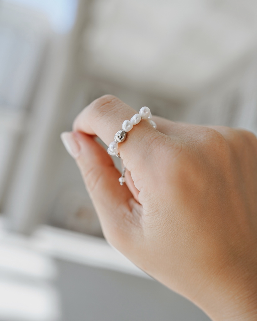 展現指尖優雅的錯落珍珠戒指,戒指採用鍊戒設計,尺寸友善可以隨自身調整,美國戒圍2~8號都可以配戴唷,隨心情穿搭想帶哪一指都行!