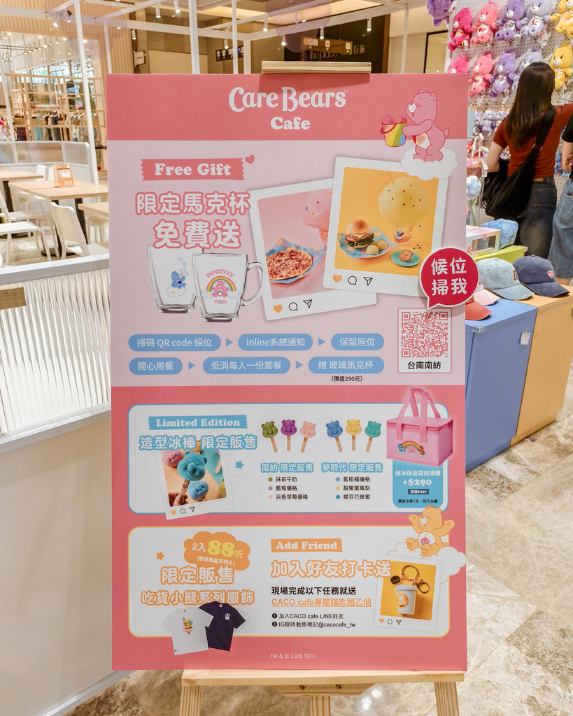 以上分享給大家啦,喜歡Care Bears的朋友快收藏起來吧,台南Care Bears™ 主題複合式咖啡廳就在台南南紡購物中心,有超療癒的整面牆彩虹熊、夢幻餐點,還有豐富限定周邊品,記得錢包和魔法小卡要帶齊!!!