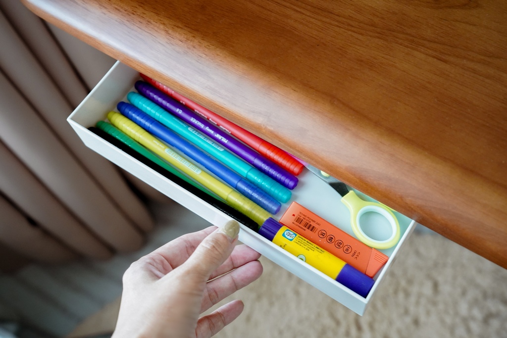 另外也可以運用COFO贈送的背膠磁鐵,也可以自行DIY磁吸收納盒,利用磁鐵吸附在桌下,就能擁有一個方便收納文具的抽屜盒啦!