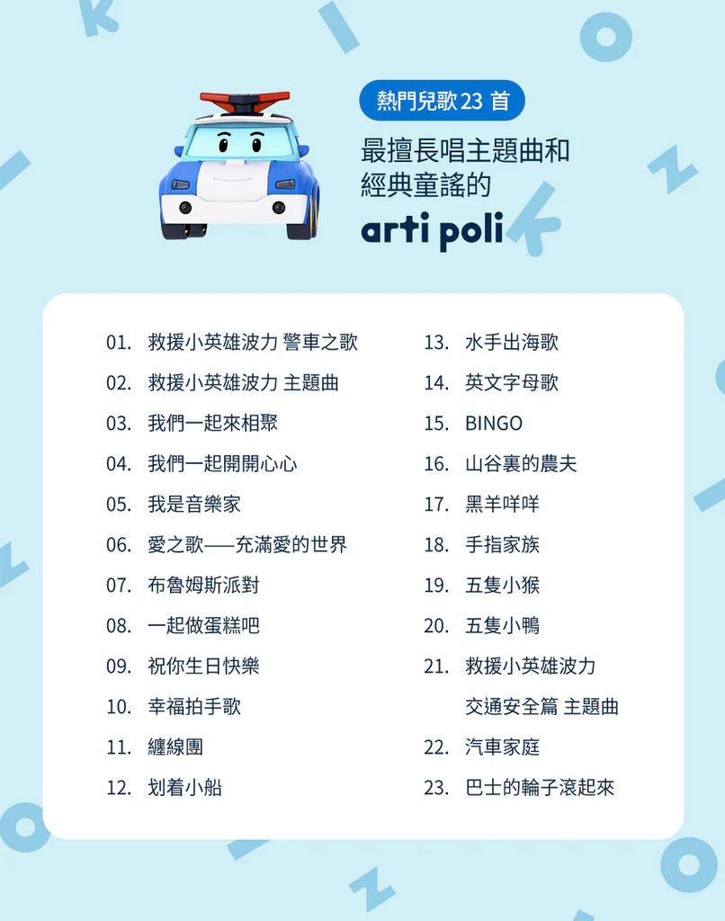 arti poli總共有23首曲目,有孩子們熟悉的主題曲還有經典童謠,唱唱跳跳的好夥伴