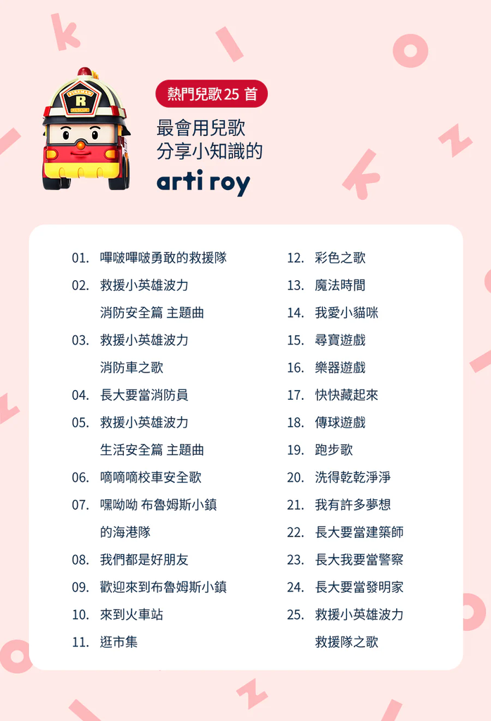 arti roy更提供了高達25首熱門兒歌,透過歌曲讓孩子可以認識生活安全小知識和職業,對於未來志向探索也很有幫助呢~