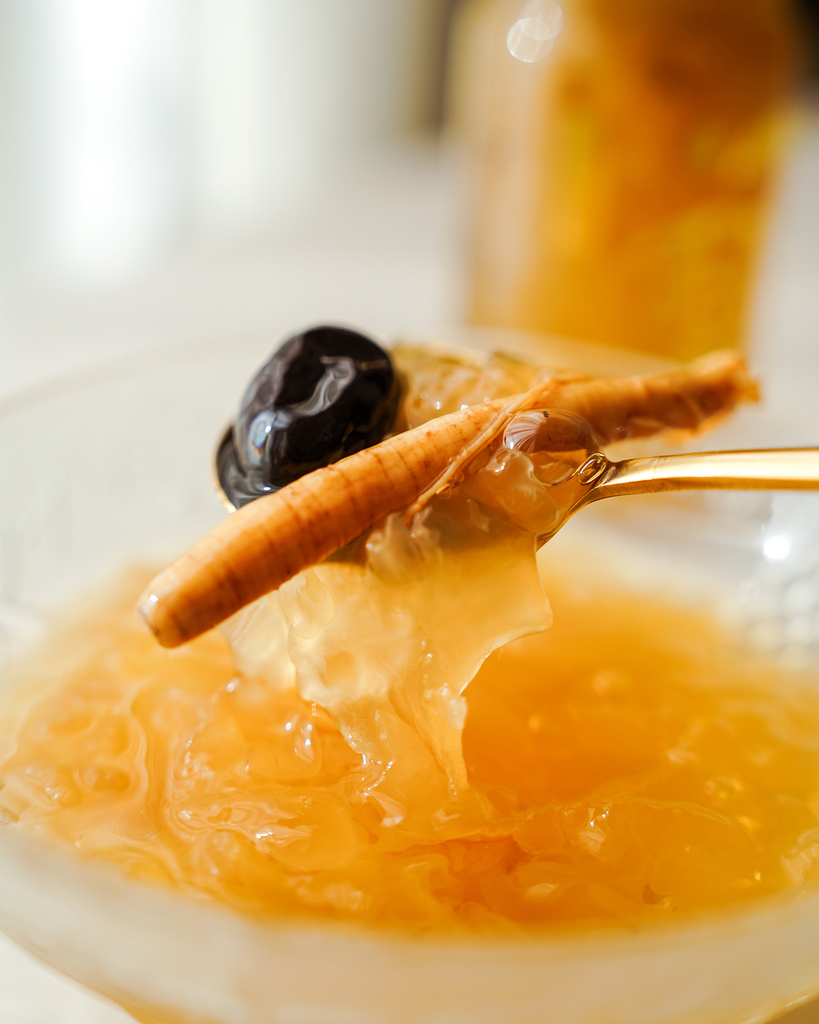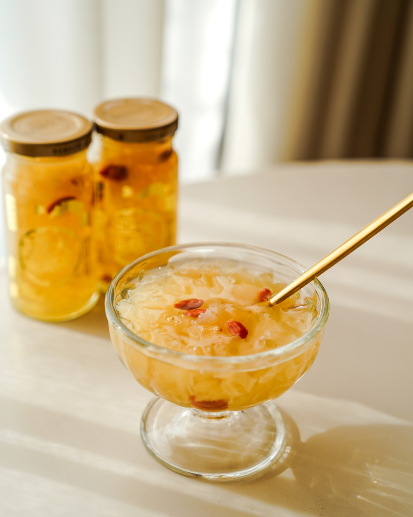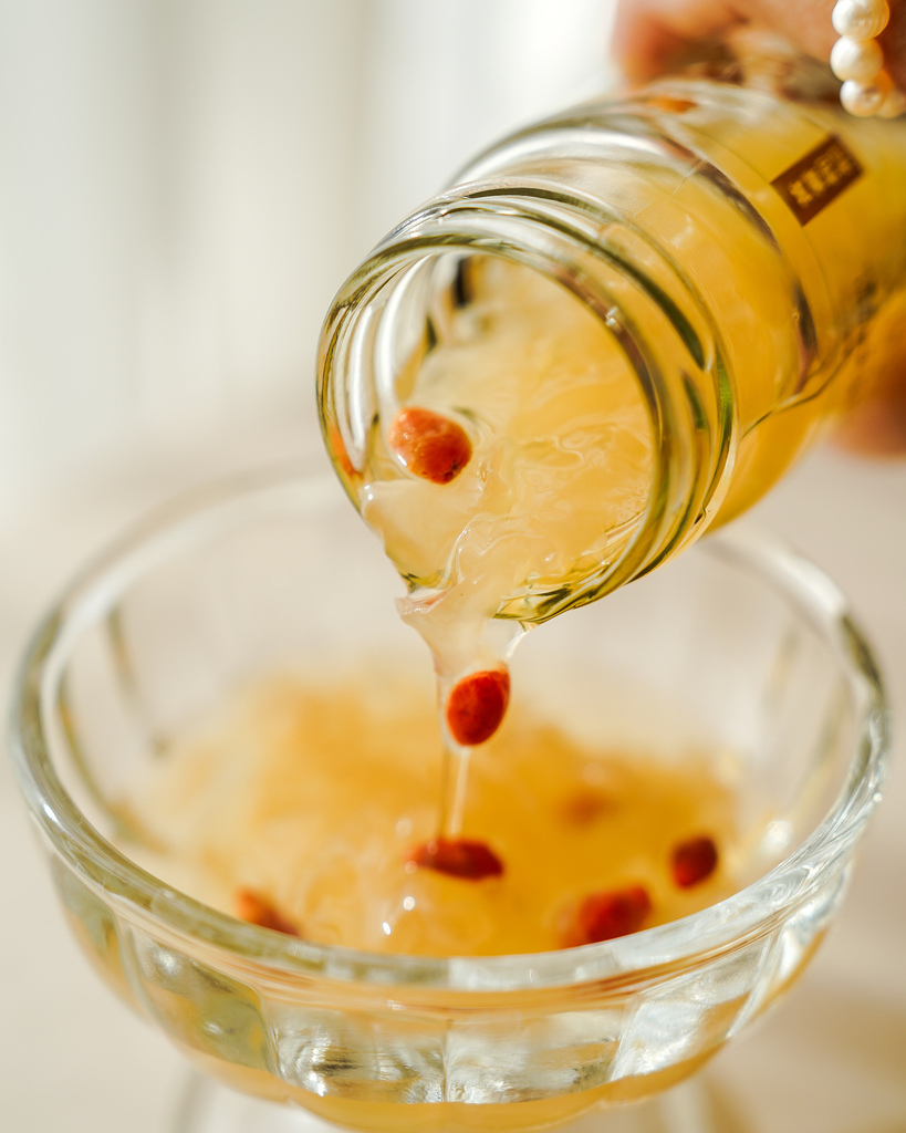 透明玻璃瓶身看得到朵朵銀耳與枸杞,就是讓人感到安心
