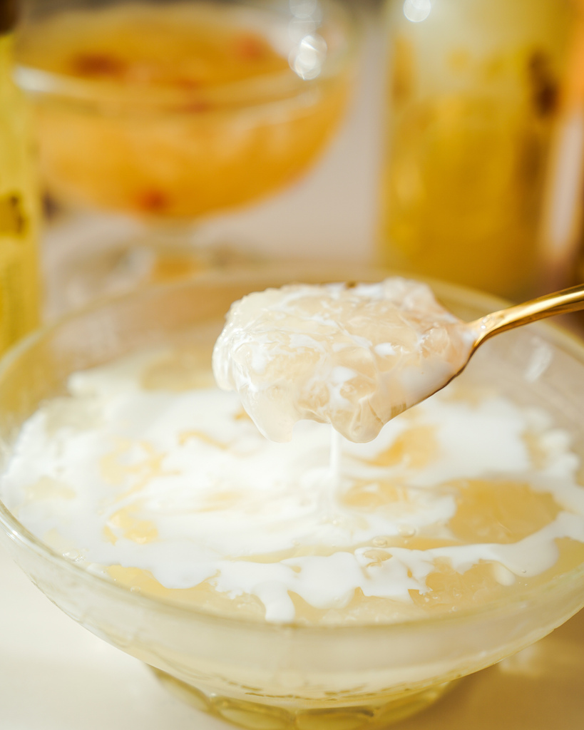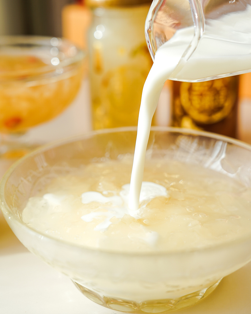 這是我很常搭配在銀耳露的吃法,加入牛奶口感更滑順了