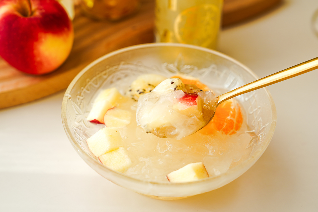 自製水果銀耳甜湯就是這麼簡單,把季節水果切成丁狀,搭配銀耳露一起享用,酸酸甜甜的水果與滑潤順口的銀耳,超好吃,而且吃完很滿足。